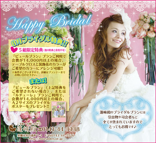 2015.8.6News★8月のブライダルご成約特典★ 0度を超える位の暑い日が続いておりますが、皆様いかがお過ごしでしょうか? さて、8月のブライダル特典ですが、新しい特典をご用意させていただきました!!! 5組限定とさせていただき、多少条件もございますが、お二人が希望される結婚式に より近づけられるようにと思って出させていただいております。 詳しくは、ブライダルプランナーまでお問い合わせ下さいませ。